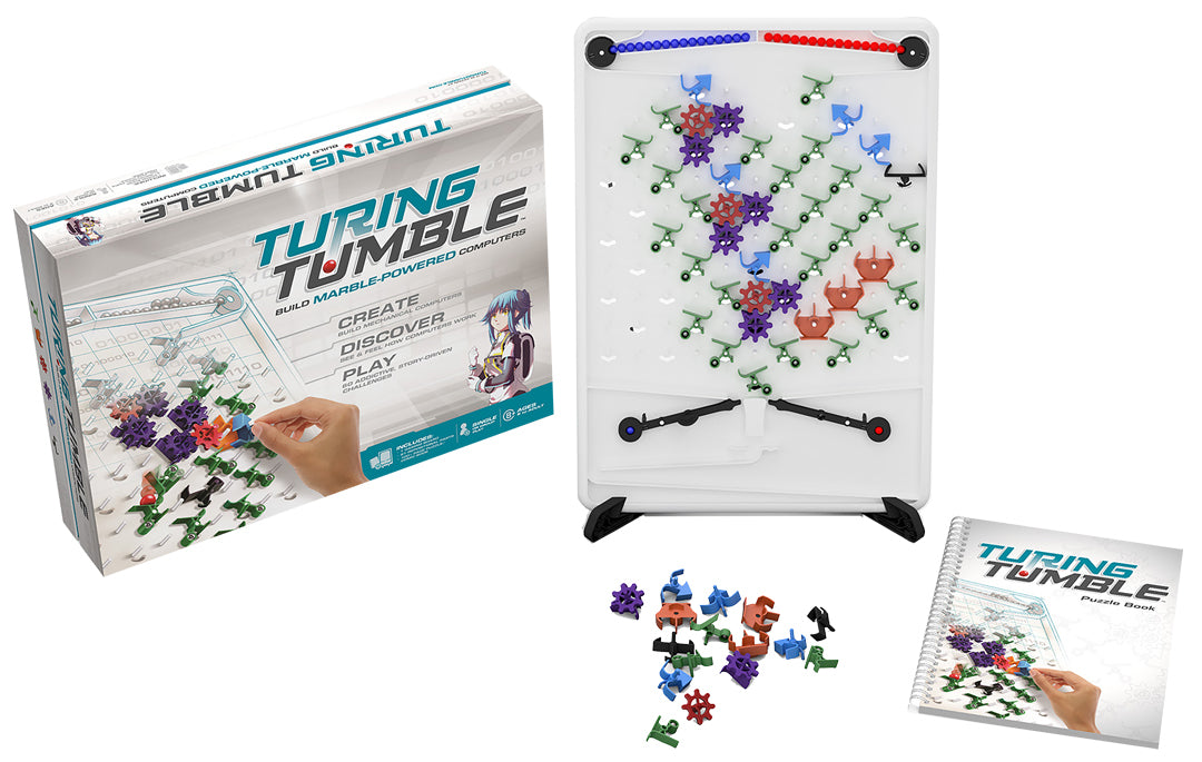 Turing Tumble is a revolutionary game where players (ages 8 to adult) build mechanical computers powered by marbles to solve logic puzzles. See how simple switches, connected together in clever ways, can do incredibly smart things. Easy to learn, hard to stop.