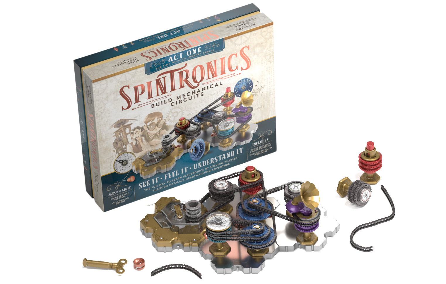 Spintronics is a new game (ages 8 to adult) where players build mechanical circuits to solve puzzles. Players feel the pull of voltage and see the flow of current as they discover electronics in a tangible and deeply intuitive way, using the first physical equivalent of electronics ever built.
